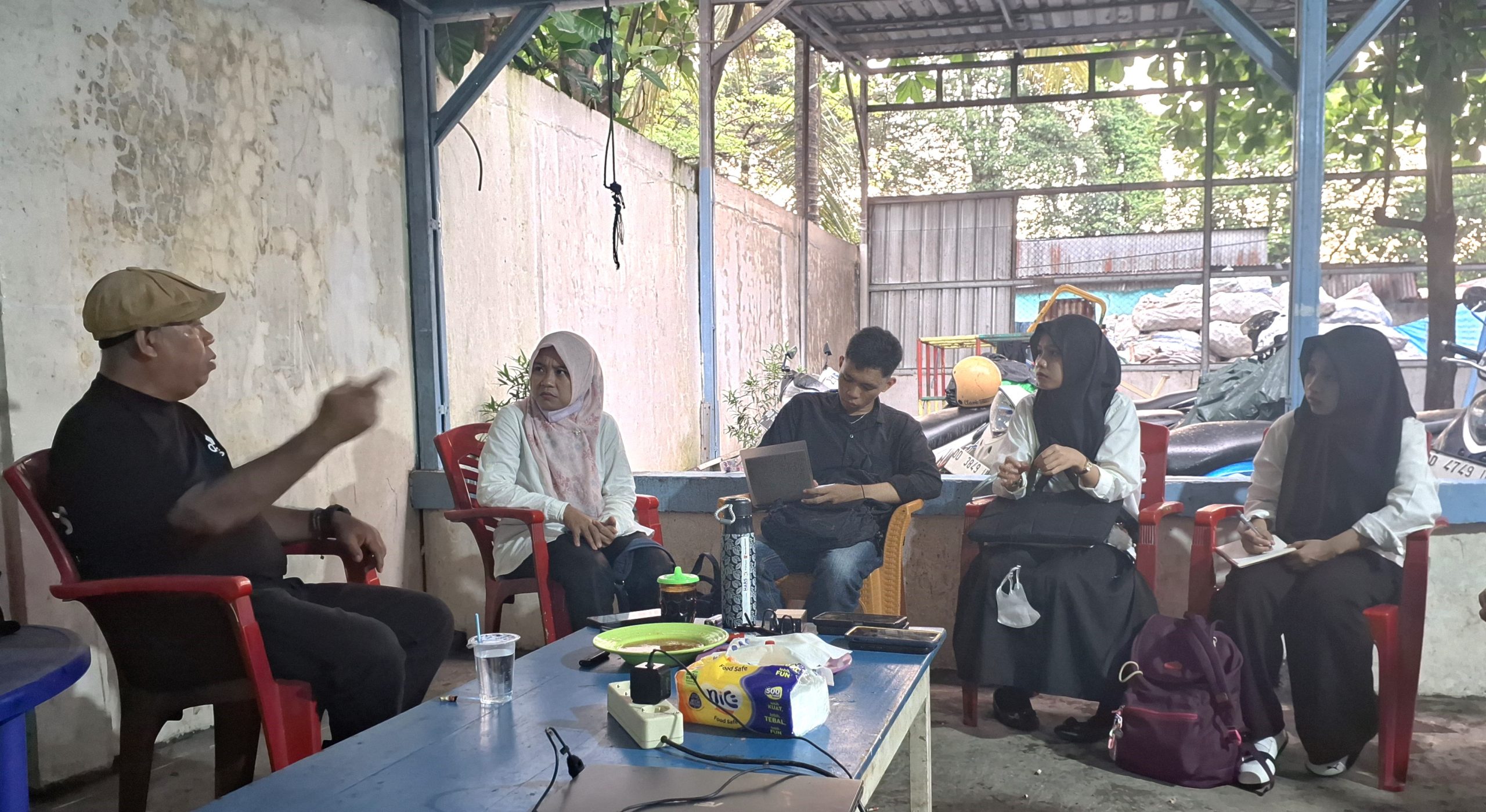 Para peneliti PKM UNM ini menilai Kak Makmur sebagai salah satu sumber yang memahami isu penelitian mereka. Inilah yang menjadi sebab para peniliti berusia muda (Gen Z) ini ngotot menerabas hujan demi berbincang dengan nara sumber mereka.