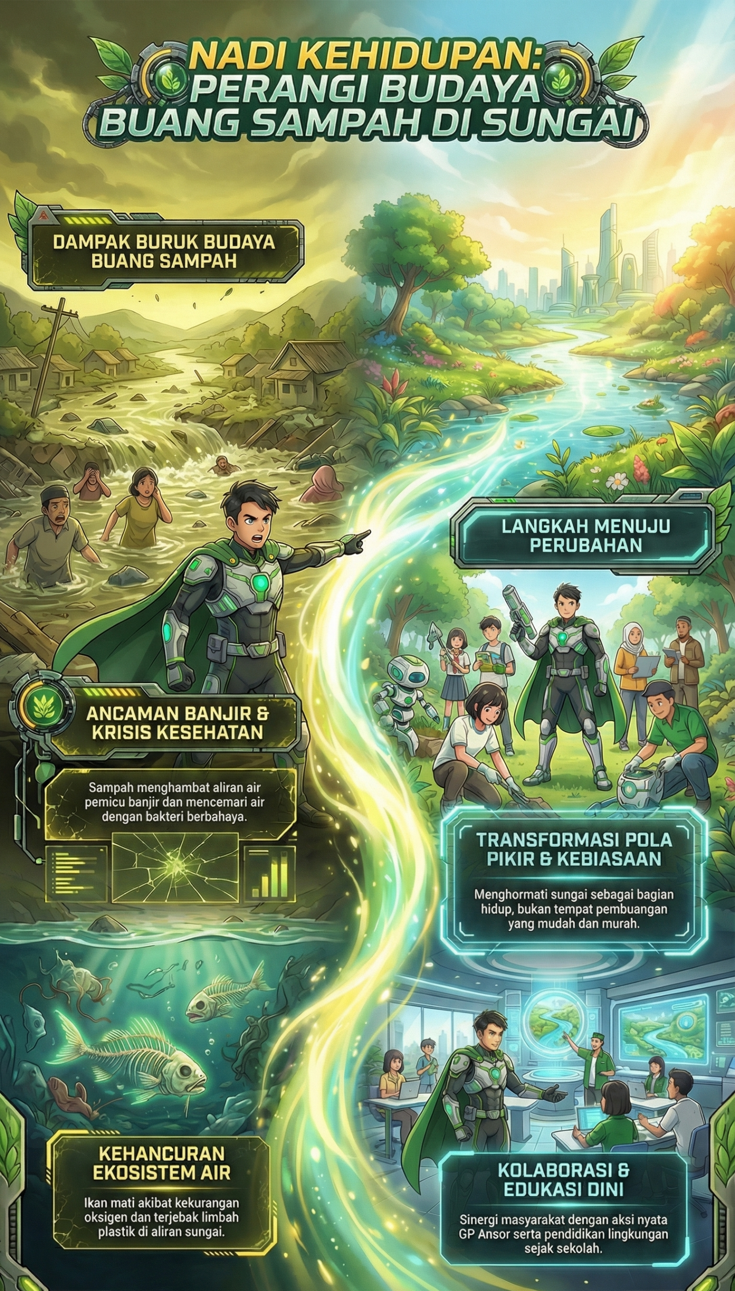 Abustan adalah sesorang kader NU yang membangun pikiran dan respon kritis terhadap fenomena sosial di lingkungannya. Menurutnya, perilaku membuang sampah di sungai bukan hanya masalah kebersihan, tetapi juga masalah keselamatan dan keberlanjutan hidup. Ketika sungai dipenuhi sampah, aliran air menjadi terhambat. Saat musim hujan tiba, risiko banjir meningkat drastis, yang dapat merusak rumah, harta benda, dan bahkan mengancam nyawa warga. Selain itu, kualitas air sungai menurun tajam. Air yang seharusnya bisa digunakan untuk kebutuhan sehari-hari menjadi tercemar, membawa bakteri dan zat berbahaya yang dapat menyebabkan berbagai penyakit. Bagi ekosistem, dampaknya juga sangat parah. Ikan dan makhluk air lainnya mati karena kekurangan oksigen dan terjebak dalam sampah, merusak keseimbangan alam yang telah terbentuk selama ribuan tahun.